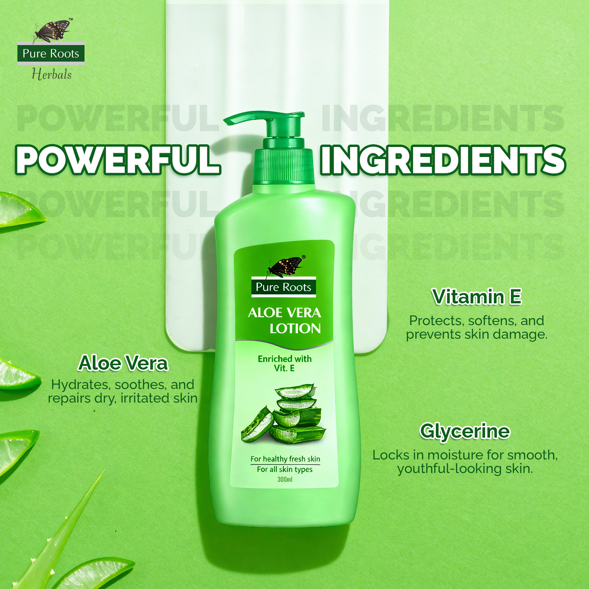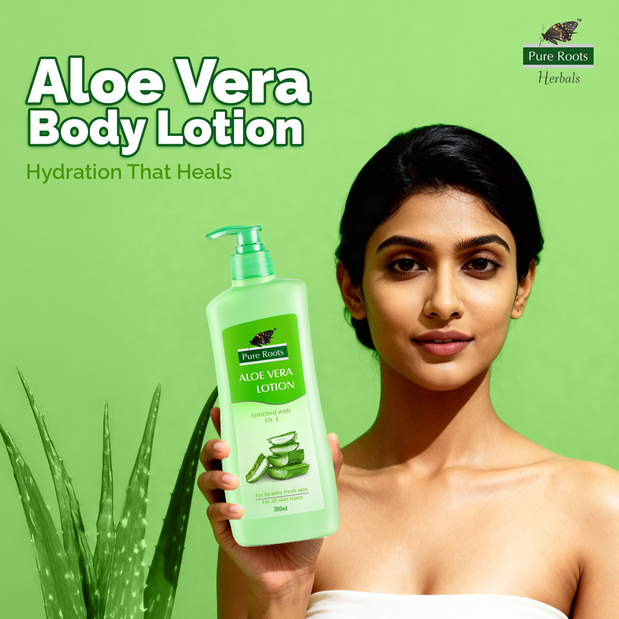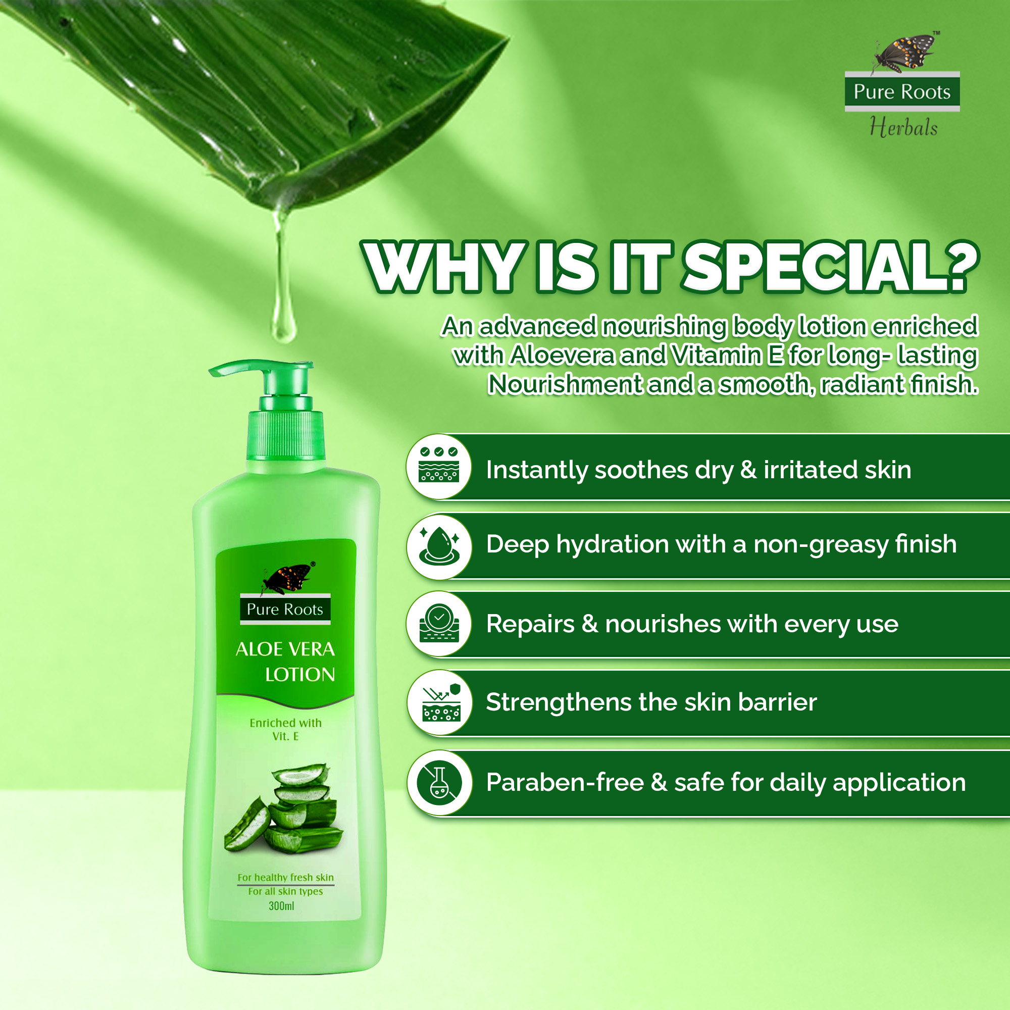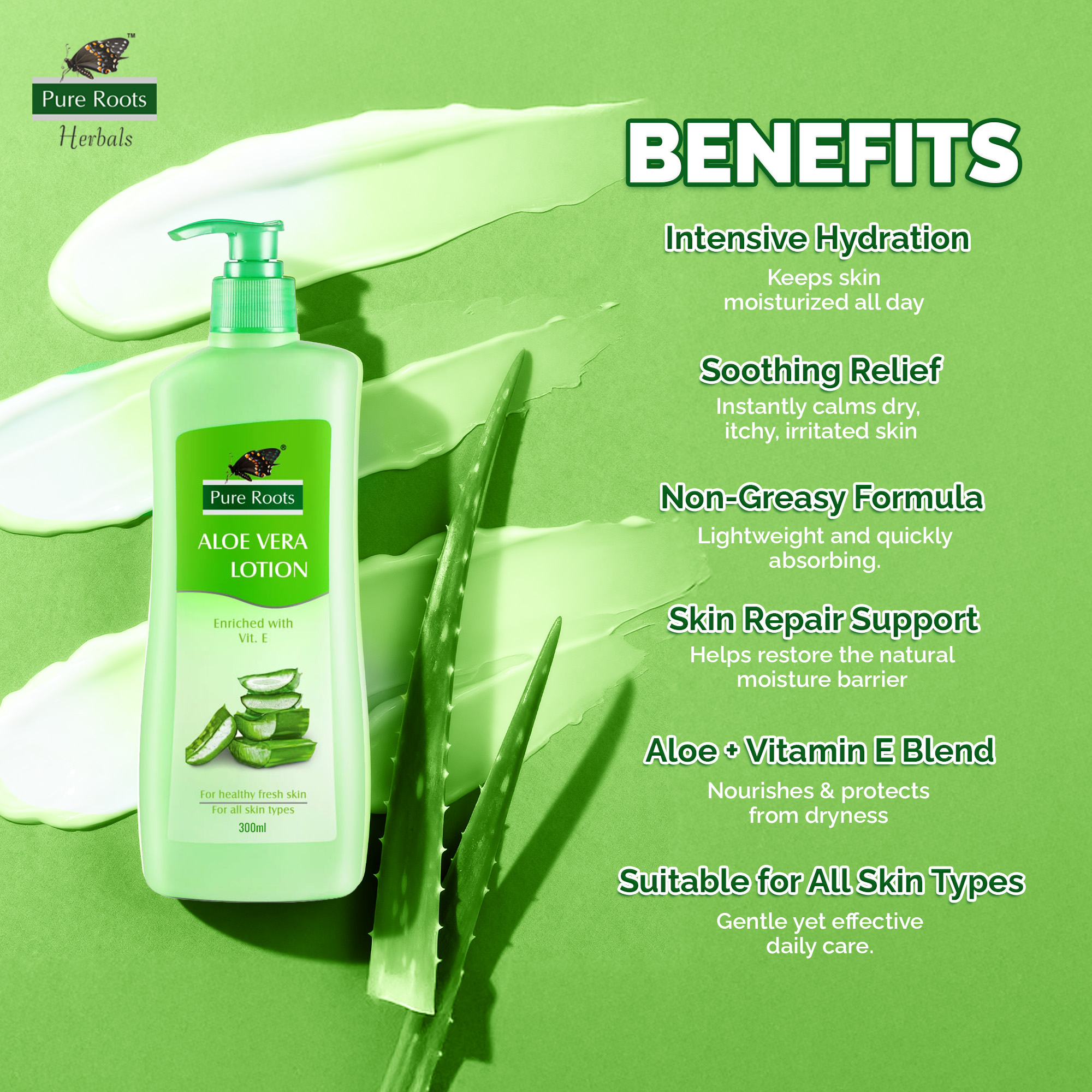 Pure Roots Herbals Aloe Vera Body Lotion is enriched with Vitamin E and designed for all skin types. This aloe vera body lotion restores essential hydration, soothes dry and irritated skin, and leaves your skin feeling nourished and soft. Its fast-absorbing, non-greasy formula provides rich moisturization, making it an excellent daily moisturizer for dry skin.