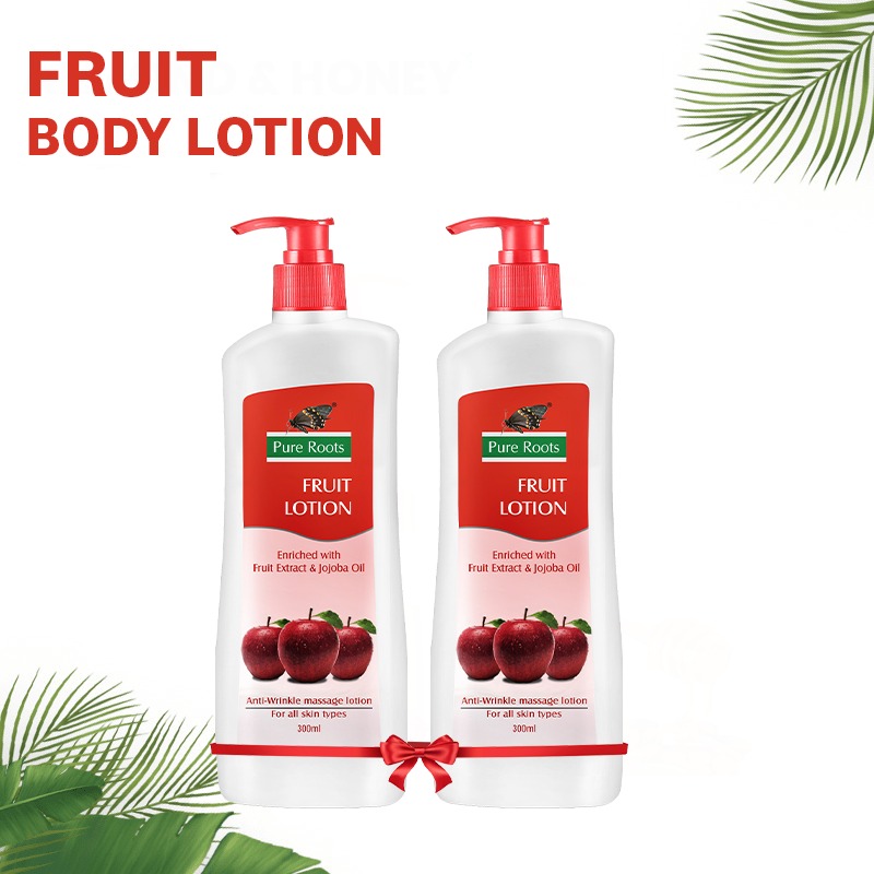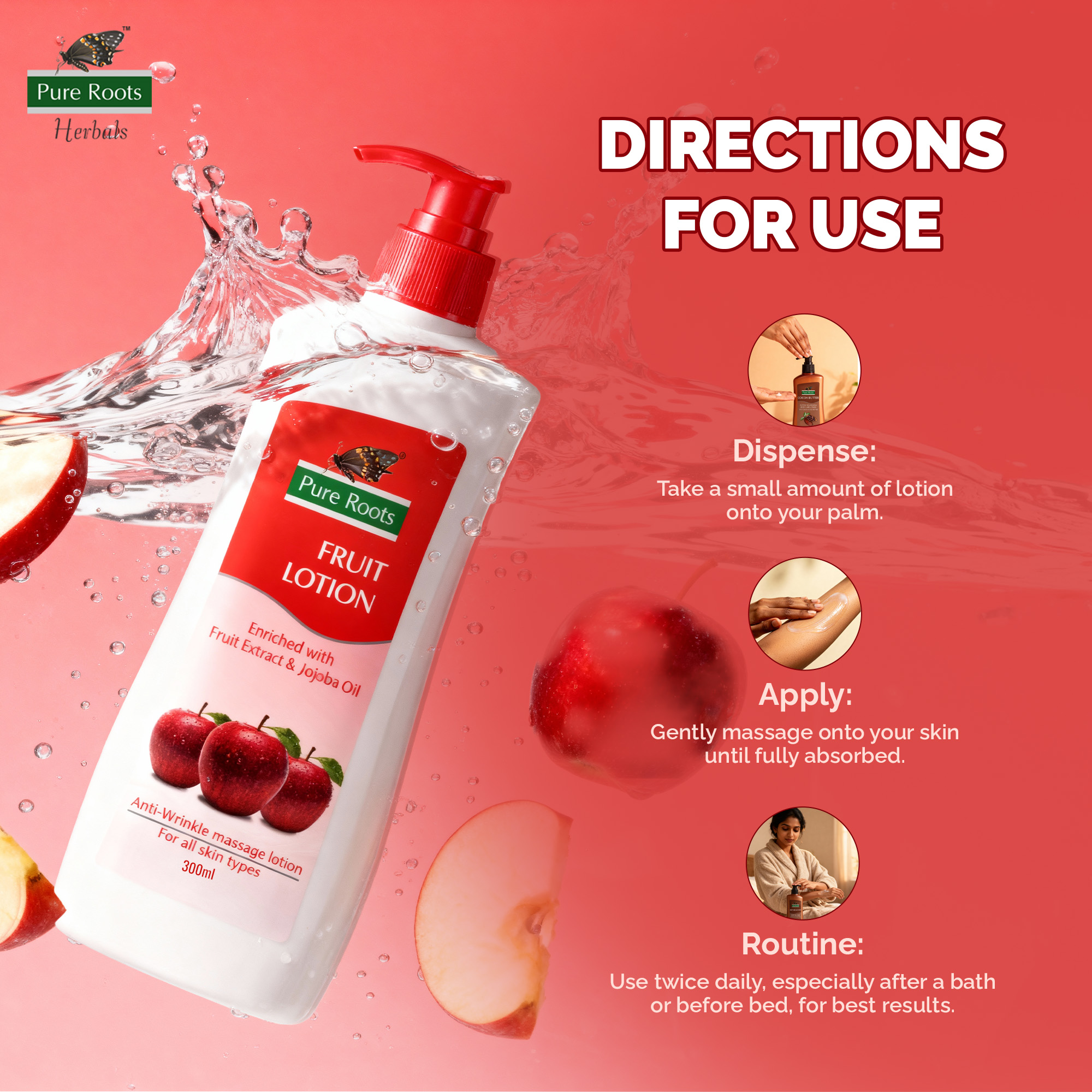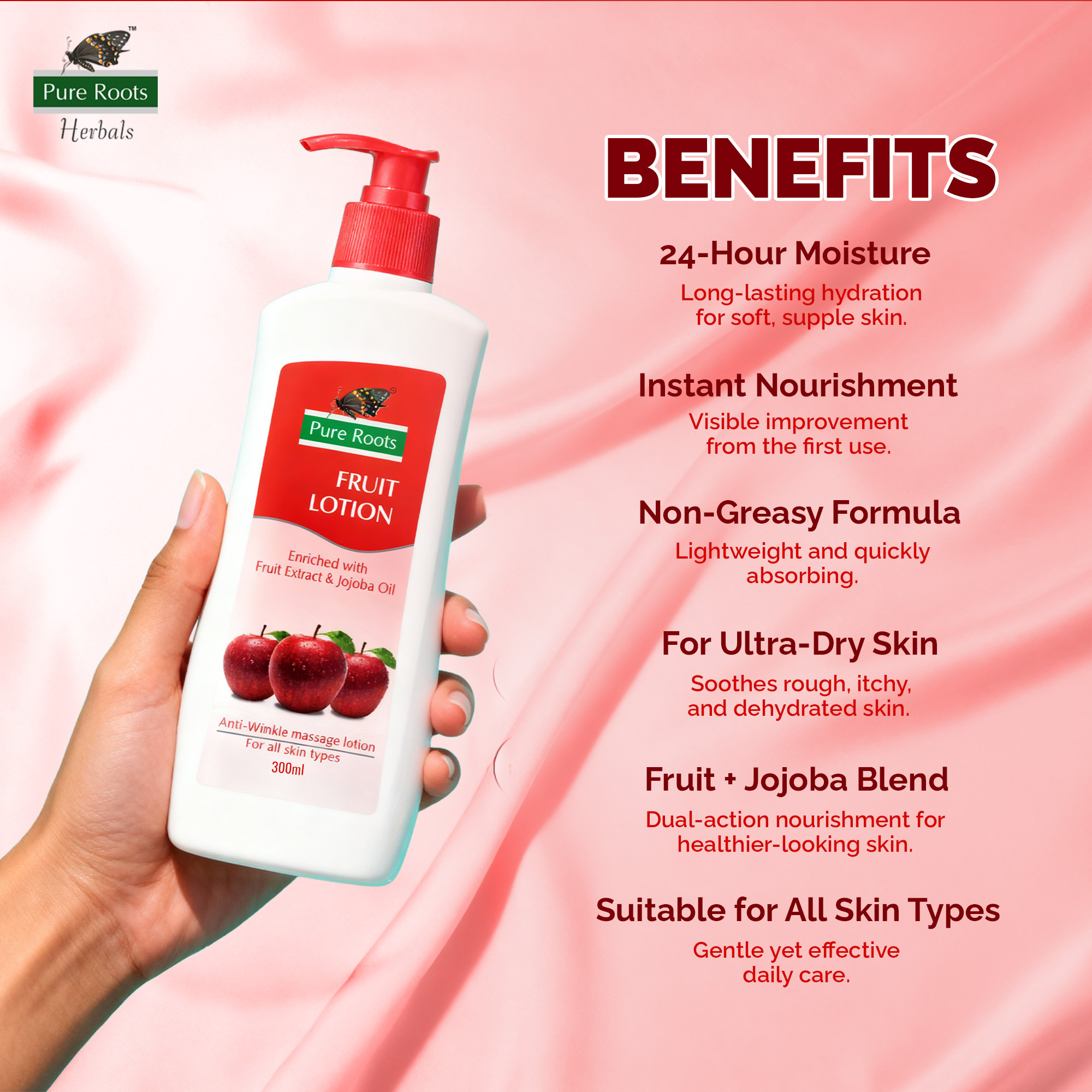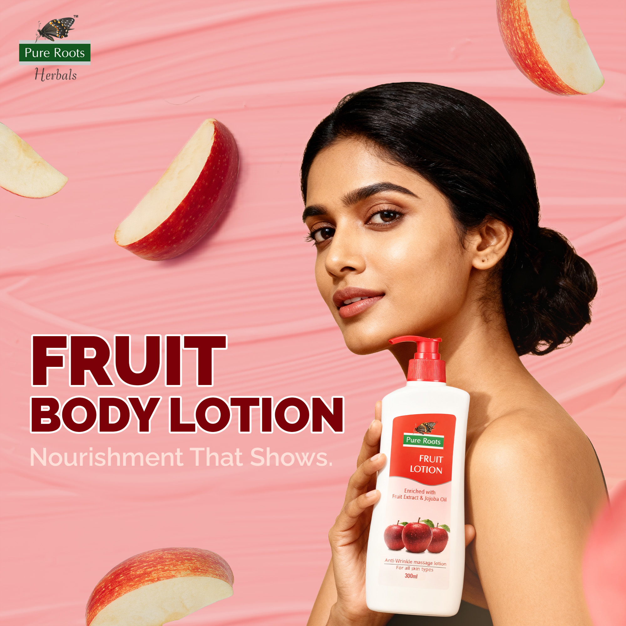 Pure Roots Herbals Fruit Body Lotion, enriched with fruit extracts and jojoba oil, is designed for all skin types. This fast-absorbing formula provides 24 hours of moisture, leaving your skin soft, nourished, and looking noticeably healthier.