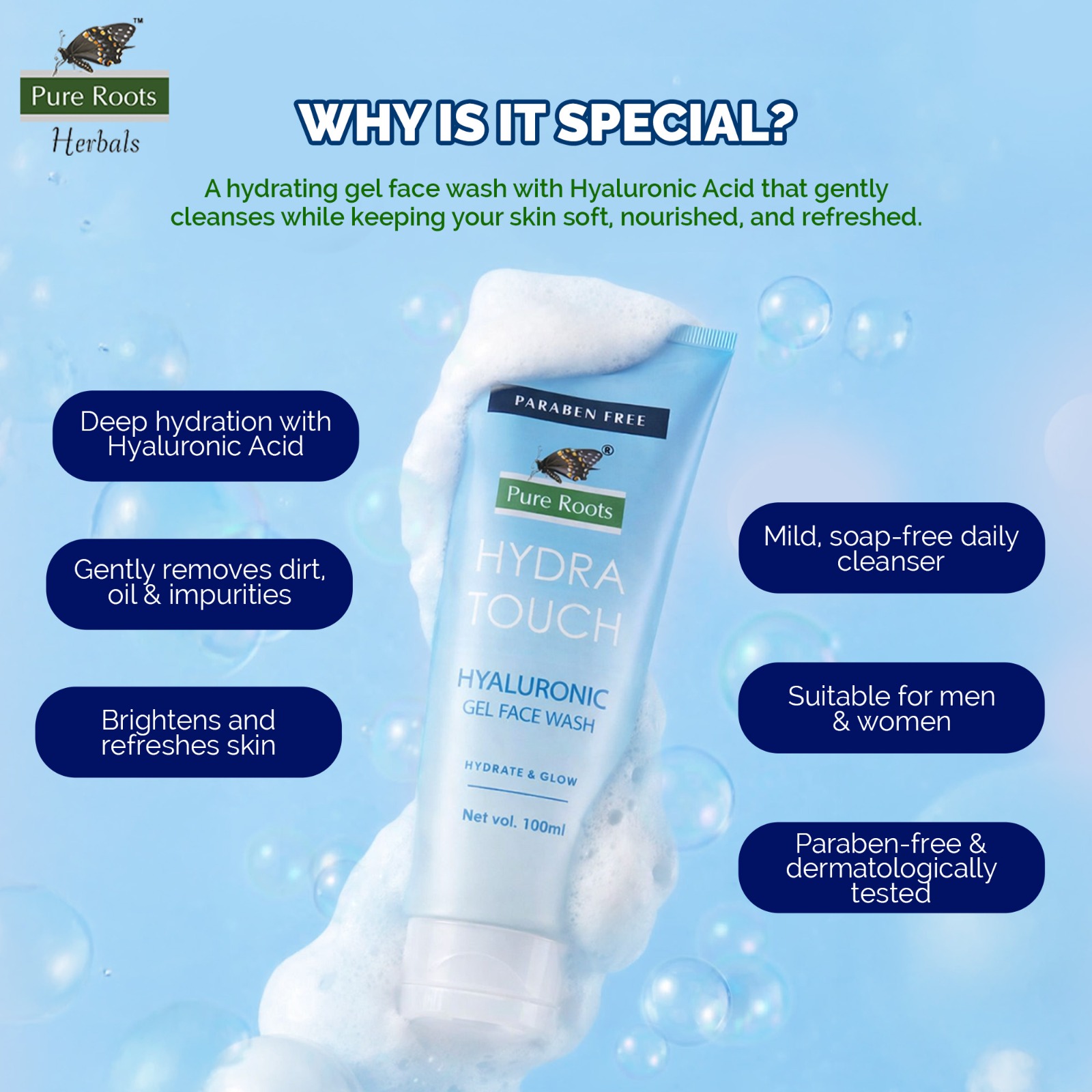 A refreshing gel face wash with Hyaluronic Acid for clean, soft, and glowing skin every day.”