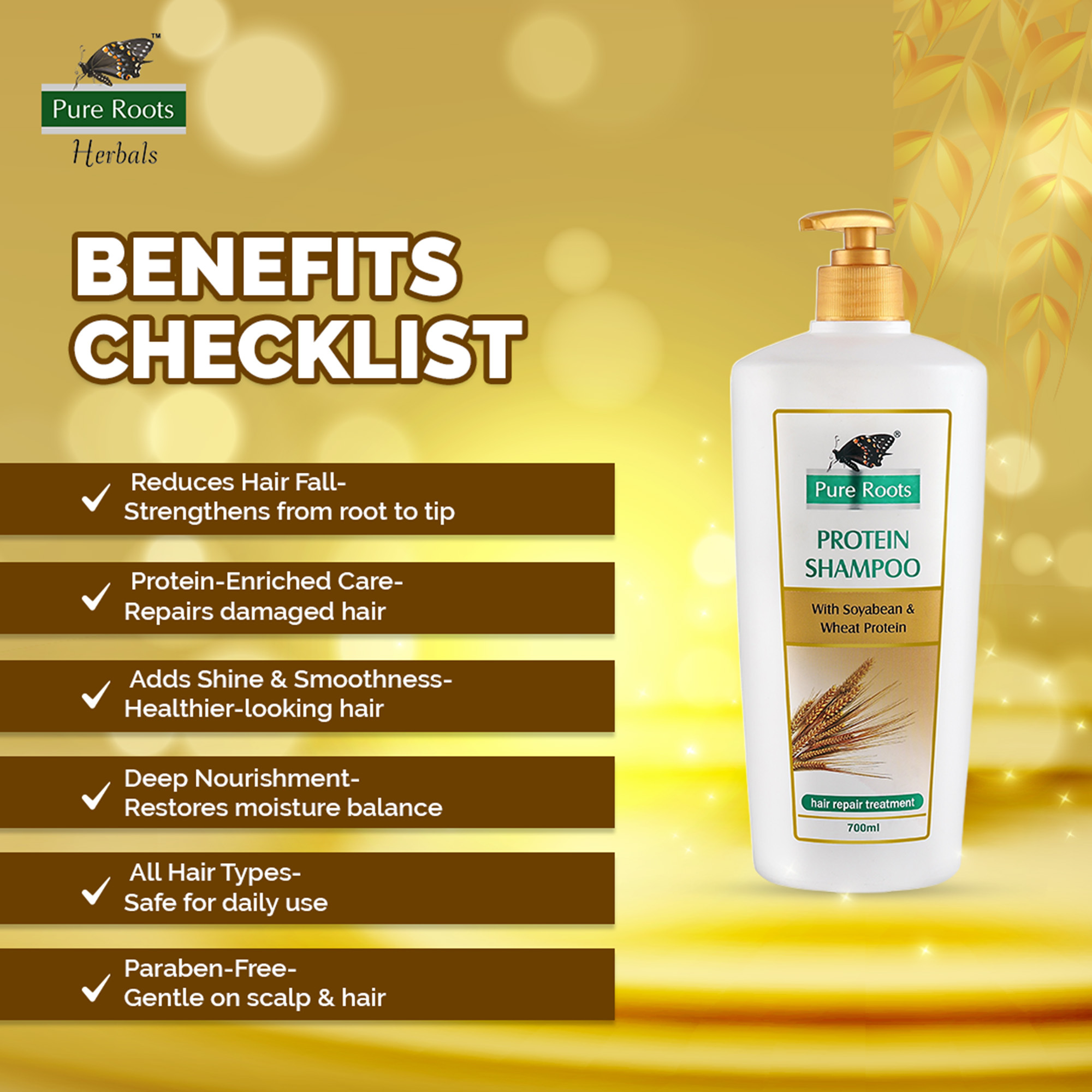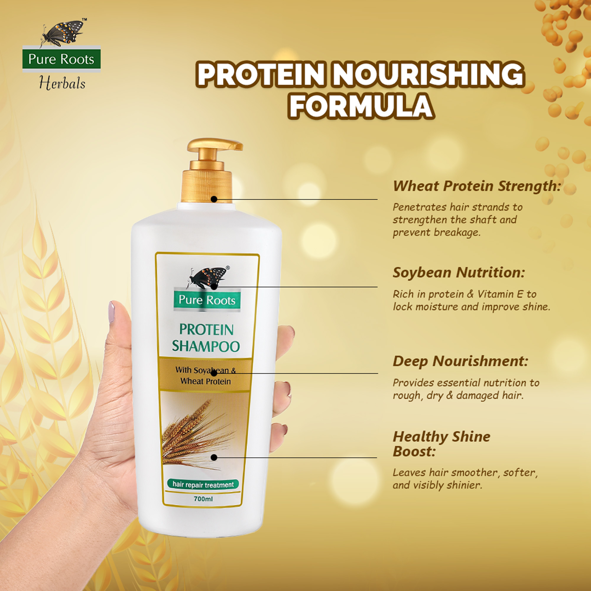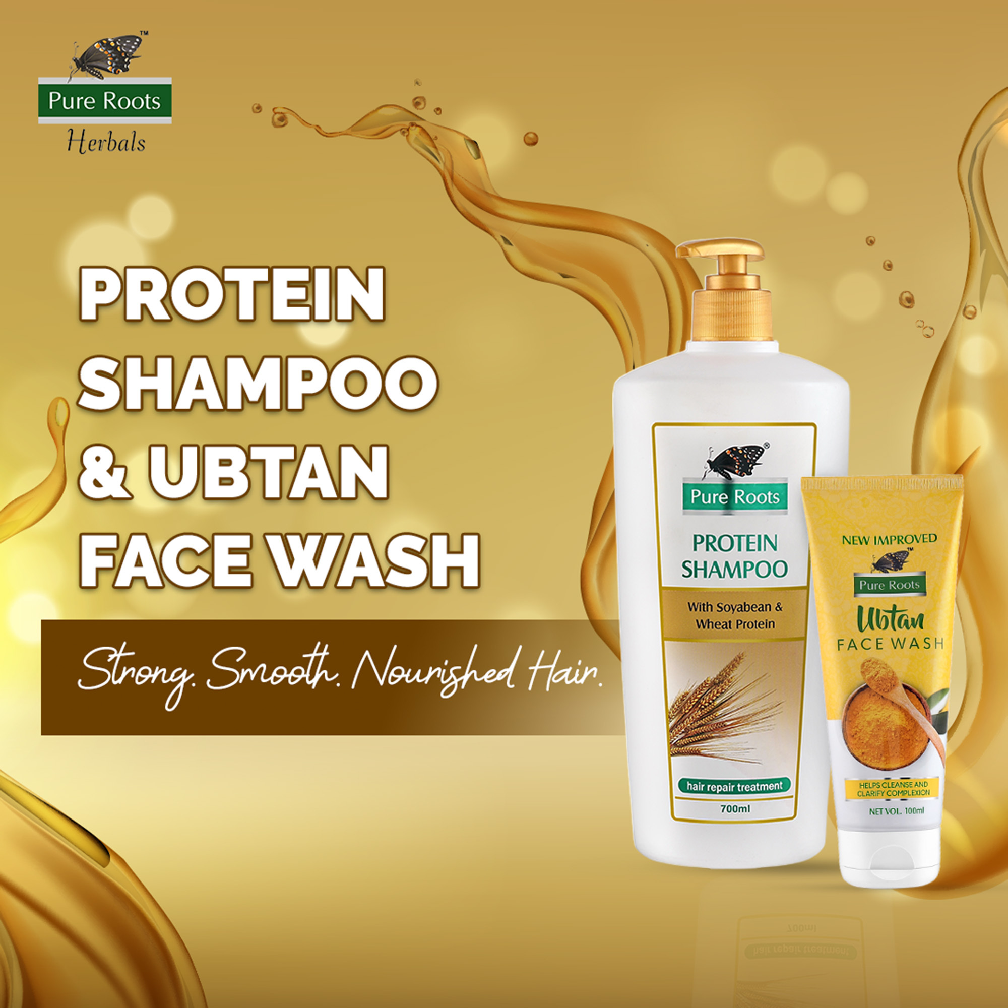 Pure Roots Herbals Protein Shampoo is formulated with soybean and wheat protein to combat rough, dry, and damaged hair. This shampoo reduces hair fall, nourishes, and hydrates the hair, making it stronger, longer, and shinier. Ideal for all hair types, it provides a vital dose of protein in every wash, ensuring your hair stays healthy and vibrant. The 700ml pack size now comes with a free 125ml face wash worth M.R.P Rs 110/-.