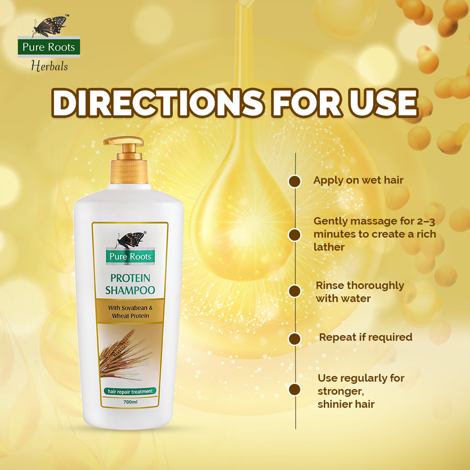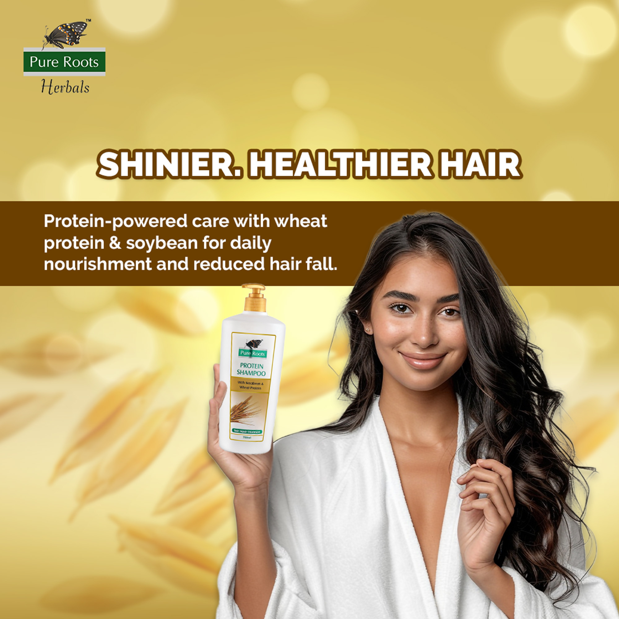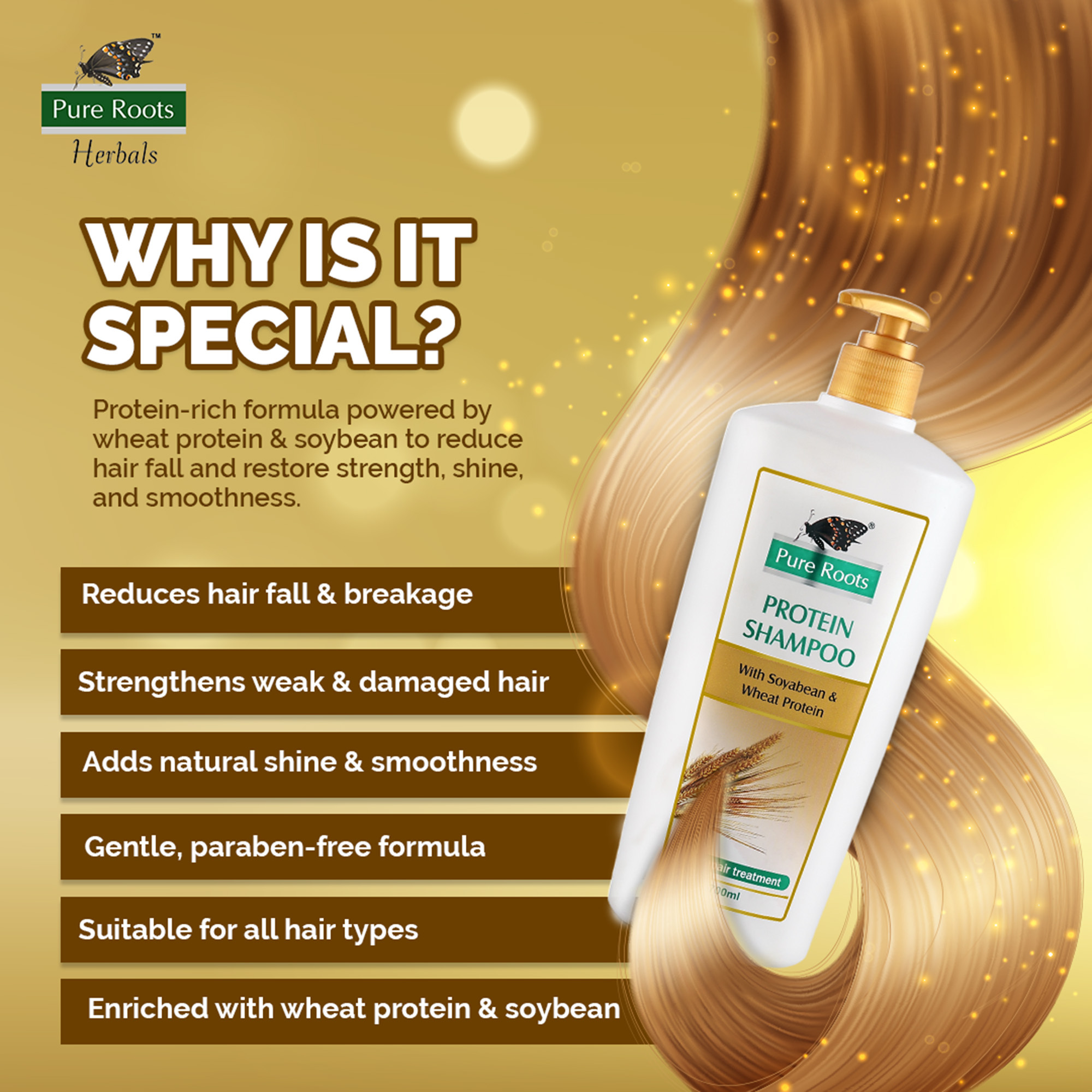 Pure Roots Herbals Protein Shampoo is formulated with soybean and wheat protein to combat rough, dry, and damaged hair. This shampoo reduces hair fall, nourishes, and hydrates the hair, making it stronger, longer, and shinier. Ideal for all hair types, it provides a vital dose of protein in every wash, ensuring your hair stays healthy and vibrant. The 700ml pack size now comes with a free 125ml face wash worth M.R.P Rs 110/-.